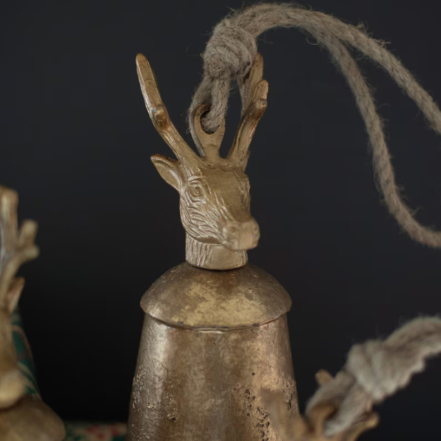 Set of 3 Antique Gold Metal Christmas Bells with Deer Finials