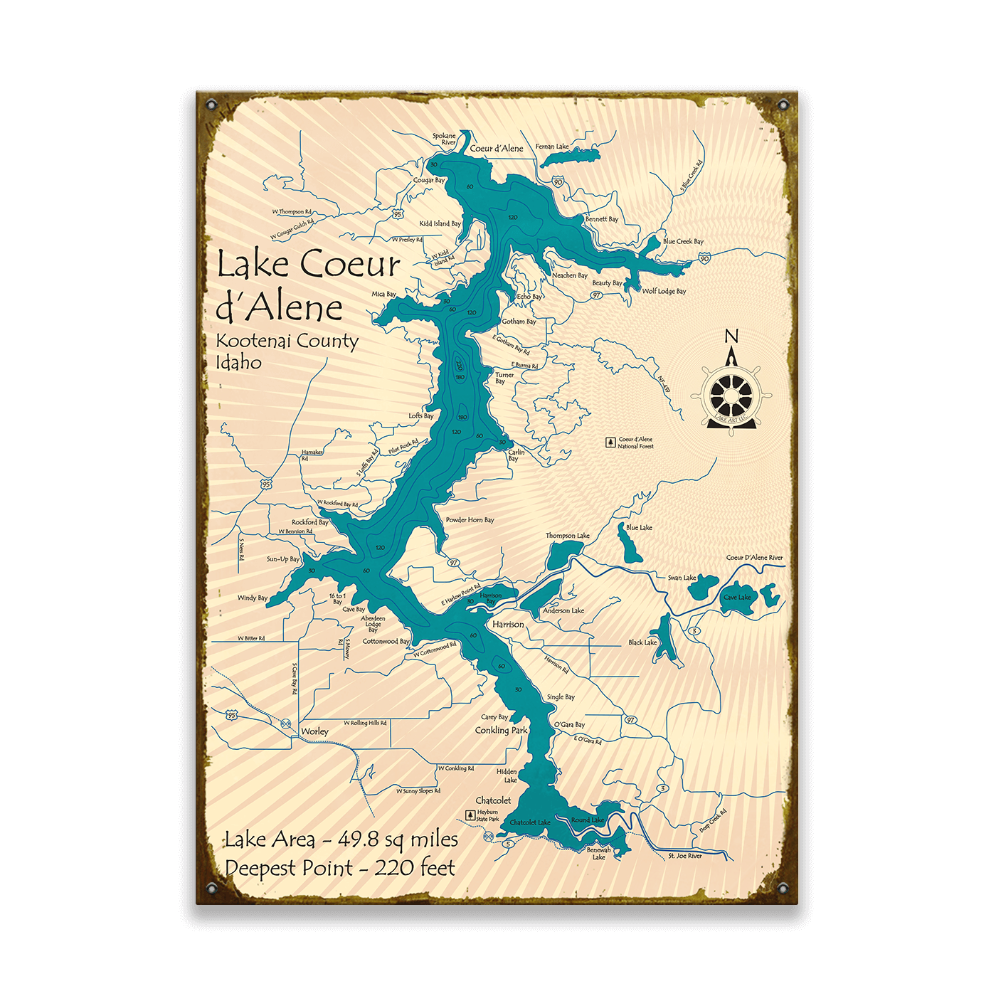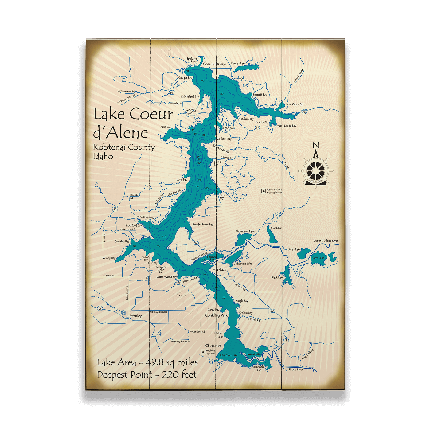 Discover the captivating beauty of Lake Coeur d'Alene in Kootenai County, Idaho, through this exquisite map representation. Ideal for enthusiasts of cartography and nature alike, this piece highlights the stunning topography and vast expanse of the lake, with an area of 49.8 square miles and reaching depths of up to 220 feet. It's not only an informative piece but also a stylish addition to any space. This map accentuates key locations and geographical features around the lake, making it a perfect reference for adventurers and locals. Add a touch of Idaho's natural elegance to your collection with this distinctive Lake Coeur d'Alene map.