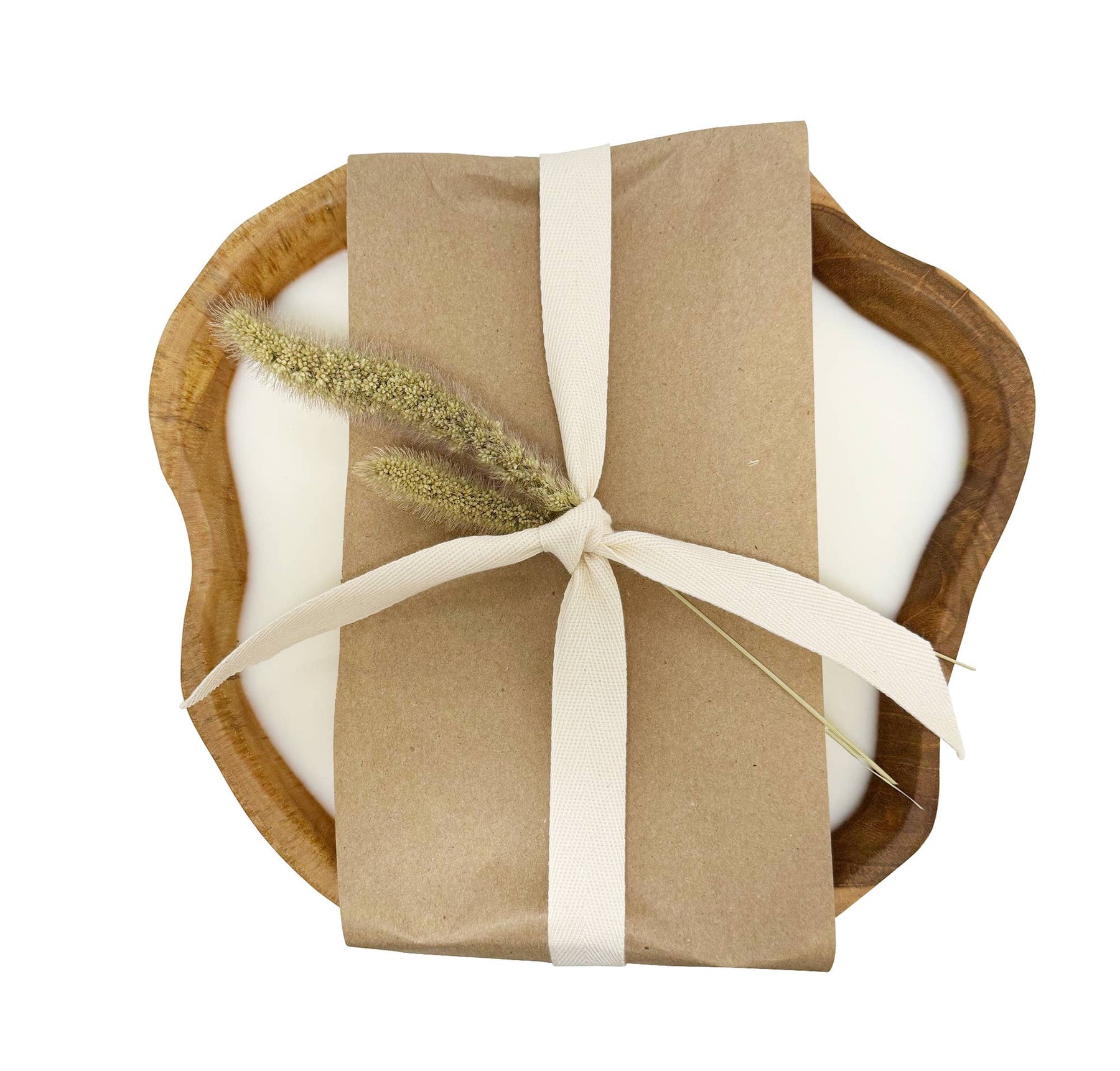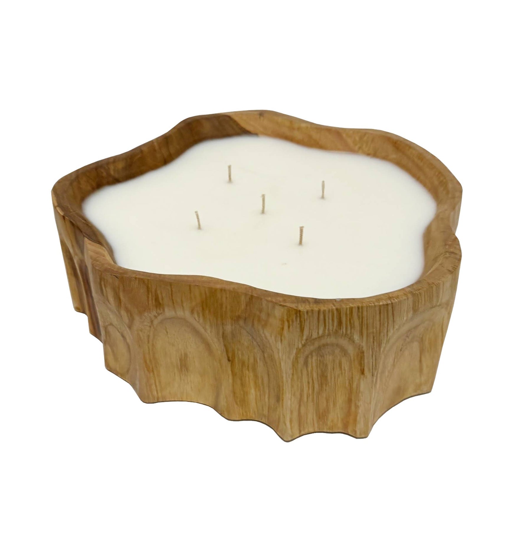 Naturally shaped and with a beautifully organic edge, this large bowl is made from gorgeous natural teak wood and filled with a soy wax blend with a subtle palo santo fragrance.