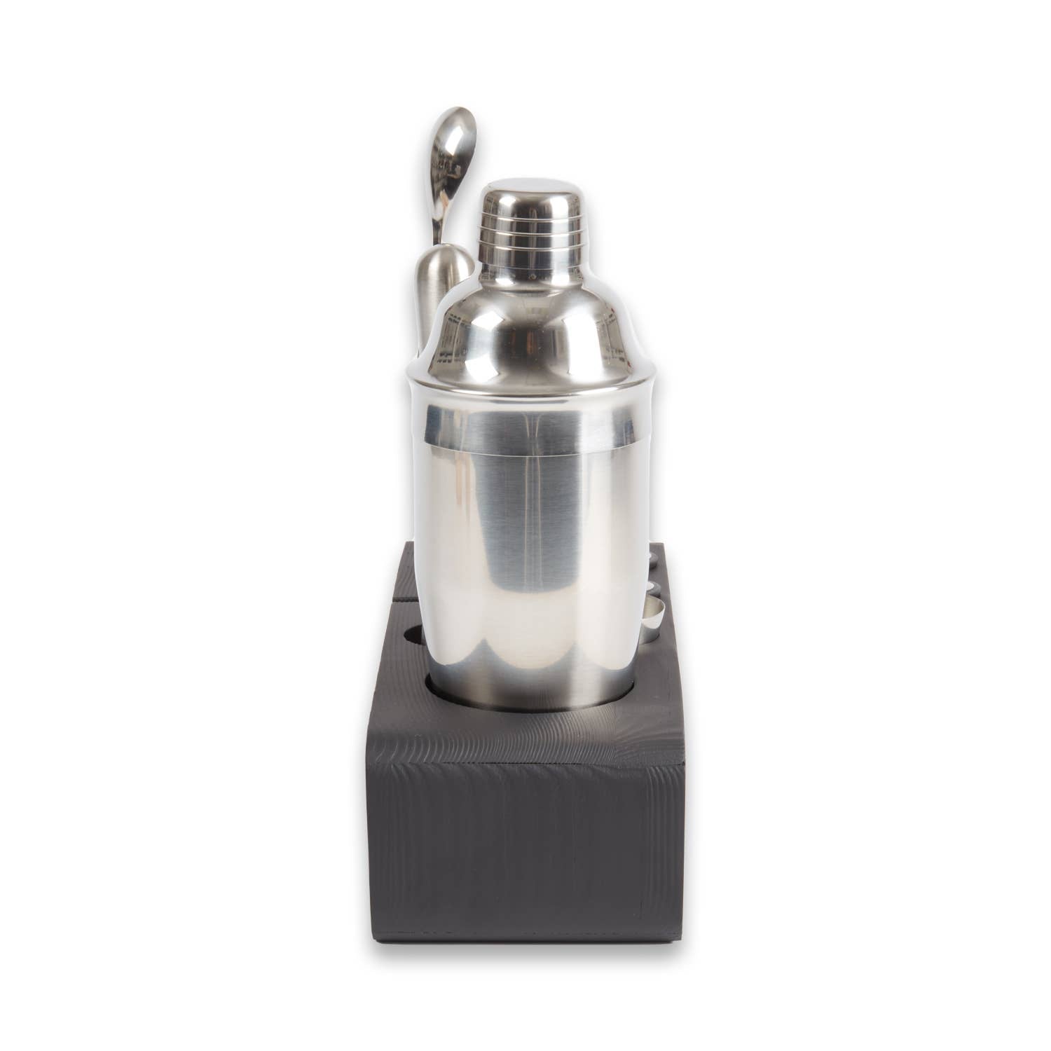 This meticulously crafted set is designed to bring elegance and functionality to your home bar, impressing both you and your guests. This bar set contains all the essential tools you need to craft the perfect cocktail. From a shaker, strainer, muddler, corkscrew, and spoon, each piece is meticulously designed to ensure your mixology endeavors are seamless. The polished stainless steel gleams with sophistication, while the black wood base adds a touch of warm contrast, creating a stunning focal point for your bar area.