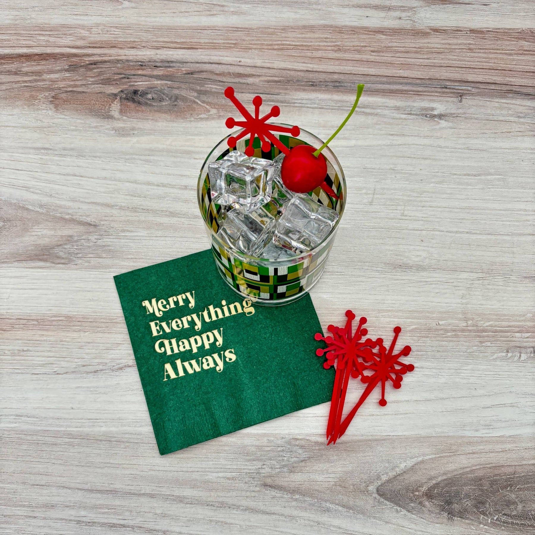 Light up the party with these chic Merry Everything Happy Always cocktail napkins! Designed with intricate gold foil retro font text on a vibrant green background, these 3-ply napkins add an endearing touch to any occasion. Celebrate with drinks, have a casual get-together, Holiday cocktail party or gift a host/hostess gift.