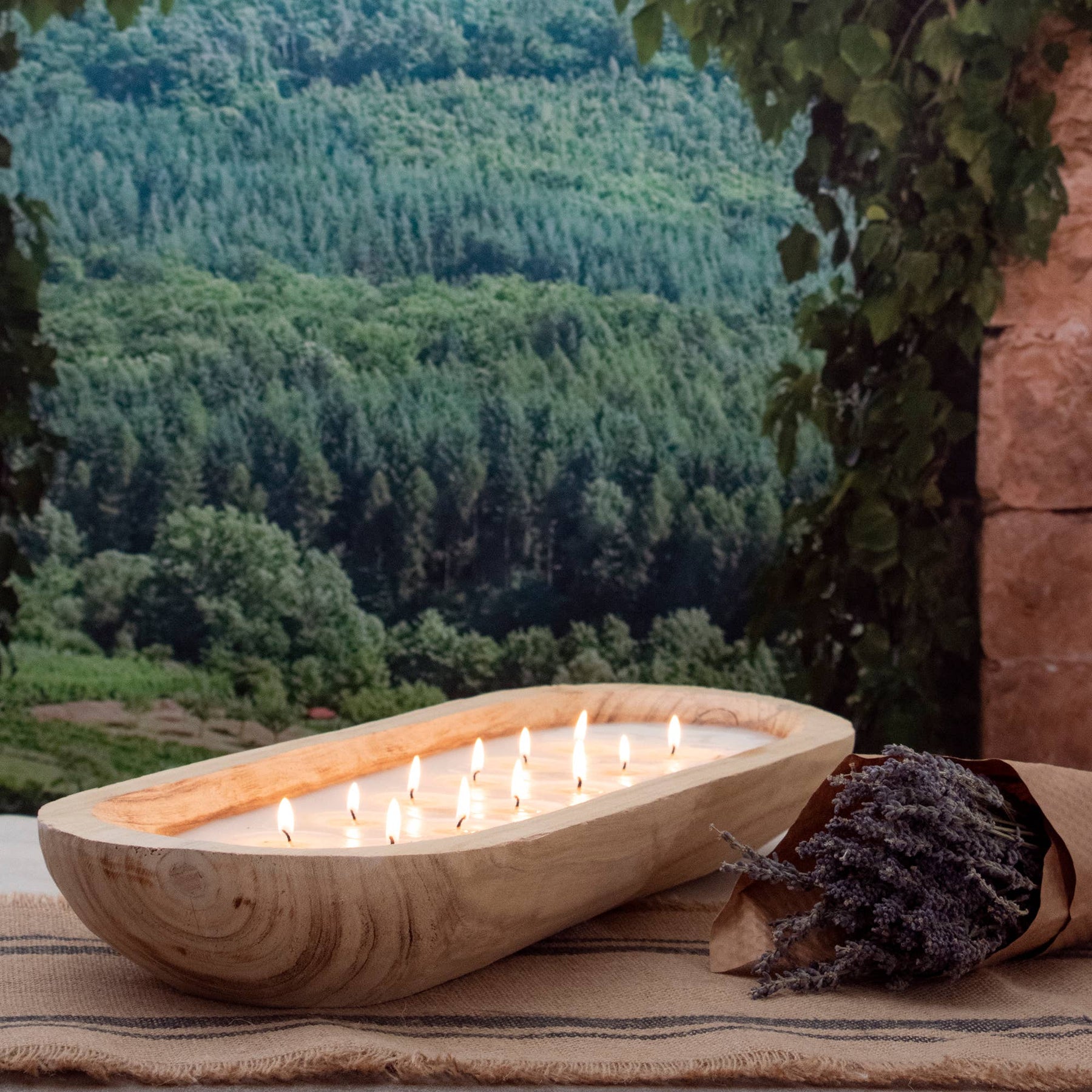 The natural character of the hand-carved Paulownia wood ensures each piece is one-of-a-kind, with slight variations in grain, texture, and color that tell the unique story of the wood. These natural elements, including minor dents, cracks, and spots, contribute to the authentic, artisanal quality of this distinctive candle arrangement.
