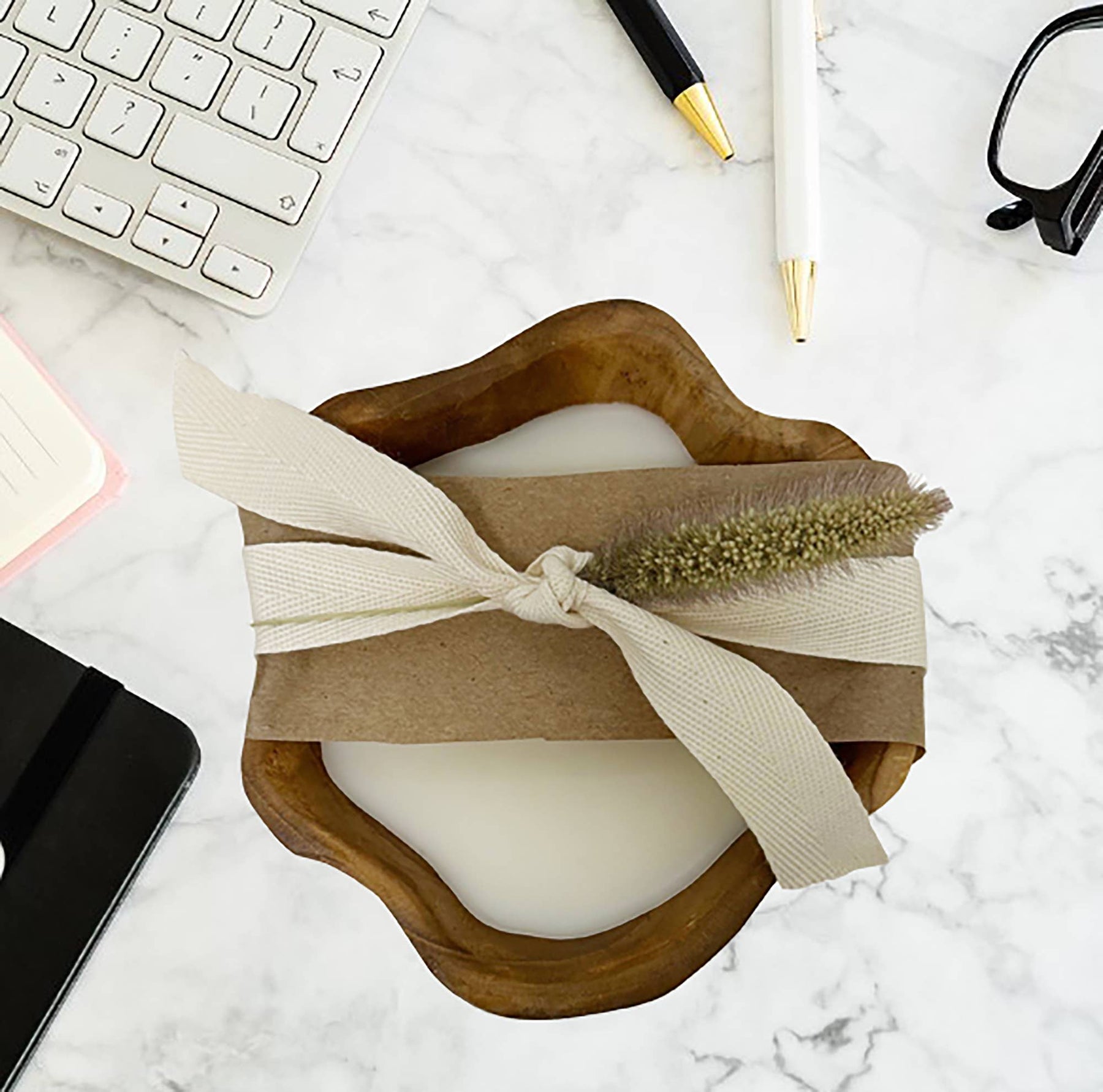 Naturally shaped and with a beautifully organic edge, this petite bowl is made from gorgeous natural teak wood and filled with a soy wax blend with a subtle palo santo fragrance.