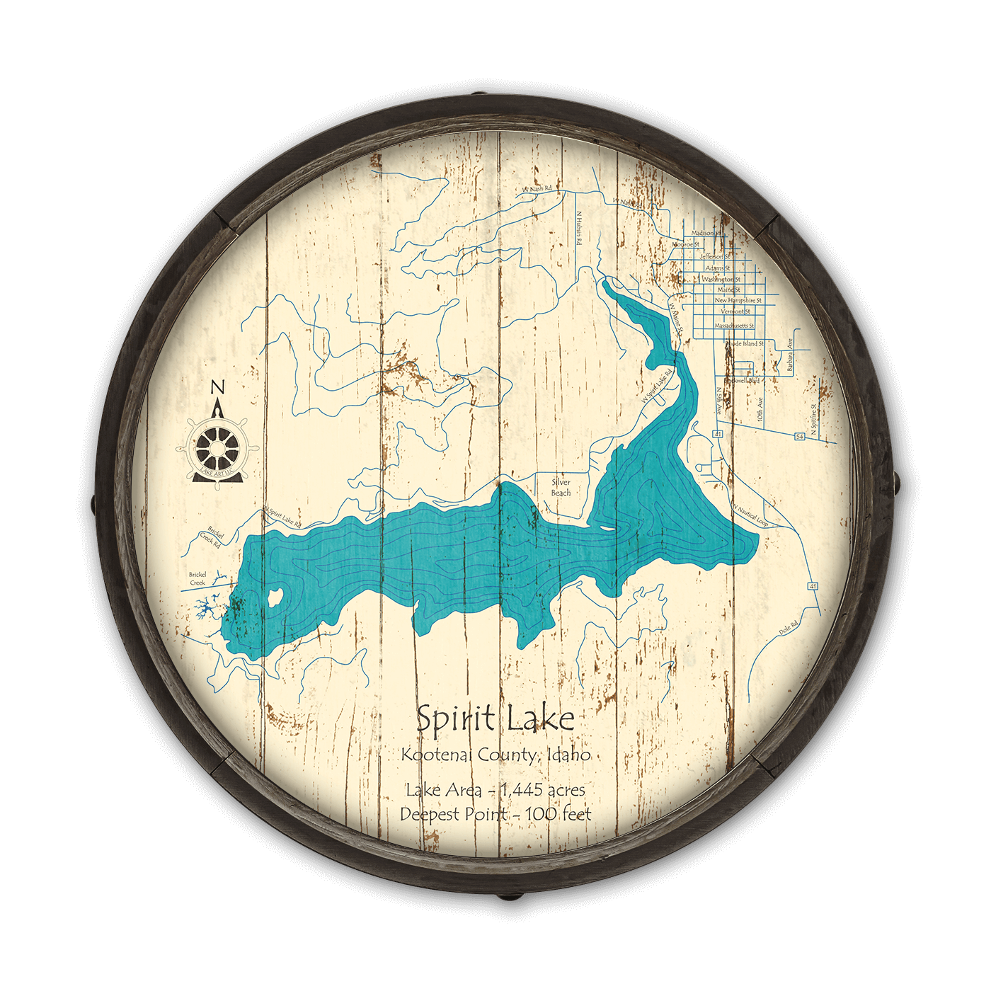 Discover the beauty of Spirit Lake, nestled in Kootenai County, Idaho, with this detailed map showcasing its unique shoreline, water depths, and surrounding landmarks. Covering 1,445 acres with a deepest point of 100 feet, Spirit Lake is a destination rich in history, natural beauty, and outdoor recreation. Whether you're drawn to its serene waters for boating and fishing, exploring the nearby trails, or simply enjoying the picturesque views, this artwork captures the essence of a beloved Idaho gem. A perfect tribute for those who cherish their time spent at Spirit Lake, whether as a local, a visitor, or an admirer of the region’s stunning landscapes.